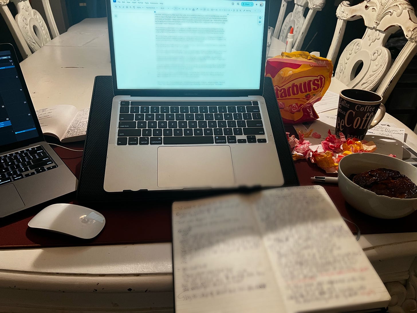 3 AM snack: Burnt bagel with olive oil and salt, coffee with entirely too much sugar, and almost an entire bag of Starburst candy. I'll probably get diabetes before finishing this book. Send help.